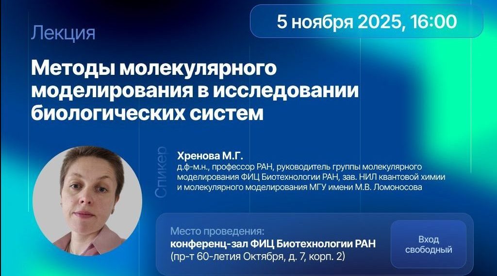 Хренова М.Г, д.ф-м.н., профессор РАН, руководитель группы молекулярного моделирования ФИЦ Биотехнологии РАН, зав. НИЛ квантовой химии и молекулярного моделирования МГУ имени М.В. Ломоносова, расскажет о методах молекулярного докинга, молекулярной динамики, квантовой химии.