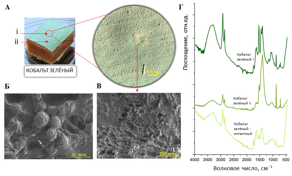 «После проведенных исследований нам стало понятно, какие художественные материалы более подвержены воздействию гриба Iodophanus sp., а какие менее. Так, связующее яичная темпера, осетровый клей, пигмент охра входят в список его предпочтений. Красные, стронциановые желтые и кобальтово-зеленые пигменты поглощаются в меньшей степени. А вот цинковые белила и все смеси с этим пигментом практически полностью блокируют рост этого гриба. Одной из причин торможения роста может являться токсическое воздействие ионов тяжелых металлов в составе краски на микроорганизм», – рассказывает руководитель проекта РНФ Дарья Авданина, с.н.с. группы генетической инженерии грибов ФИЦ Биотехнологии РАН.